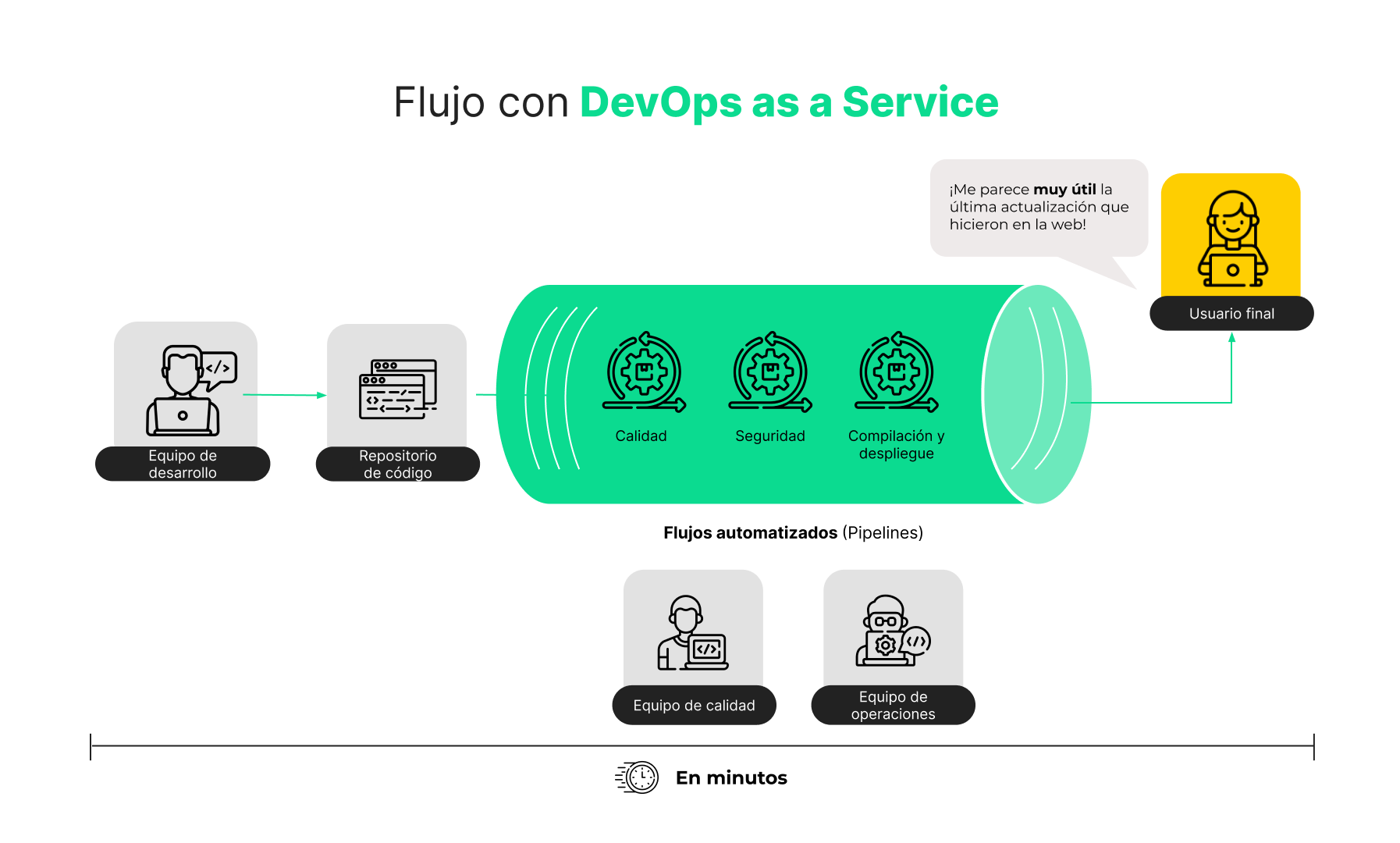 Con DevOps as a Service automatiza tus procesos manuales y lanza nuevos productos o más funcionalidades en tus activos digitales muy rápidamente.